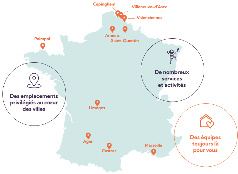 Nous avons choisi avec un grand soin l’emplacement de nos résidences pour simplifier votre quotidien. Proches des commerces, des services et des transports, elles sont implantées dans le cœur des villes. Elles accueillent coiffeur, professionnels de santé, coachs sportifs, pour tout avoir à proximité et favoriser les rencontres entre générations. Et vous gardez votre animal de compagnie, il s’y fera de nombreux amis.
